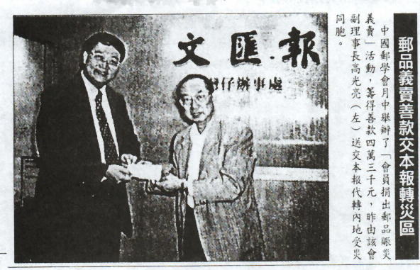 | 中郵會近期簡訊 - 最近 , 本會與郵政署合作出版的兩本關於香港郵戳的專著----『香港包裹郵政及日戳』和『香港郵政用圓型膠戳』亦完成編著工作准備付印 . 為趕及在九八郵展中參展 , 特製作了一套精裝本 . 有關這兩本郵書的進一步消息 , 請留意會訊 .- 九八年八月十五日 , 幾位青少年會員劉靜言 , 陳子健及廖佩佩代表中郵會到亞洲電視錄影有關集郵節目 . 錄影片段分別於八月十七日及二十四日的『精靈一族』之自己人時間內播出 . - 中郵會於九八年九月二十六日與郵政署集郵組聯合舉辦集郵講座 , 對象是學校集郵小組 . - 中郵會與香港郵學會及尖沙咀郵學會聯合舉辦的香港九八郵展於十月一日至四日在香港大會堂展出 , 展出框數一百八十框 . - 九八年夏季 , 中國長江流域及東北地區發生嚴重的水災 , 中國郵學會仝人為幫助受災同胞渡過難關 , 重建家園 , 決定在九八年九月十九日星期六下午舉行郵品義賣 , 捐款賑濟水災災民 . 這次活動共為水災災民籌得港幣四萬三千元 . 另在九月二十八日 , 高光亮副理事長代表本會將賑災郵品義賣所籌得的善款四萬三仟元送給文匯報中國內地水災賑災委員會代為轉送給受災同胞 . |