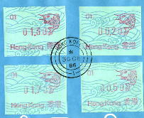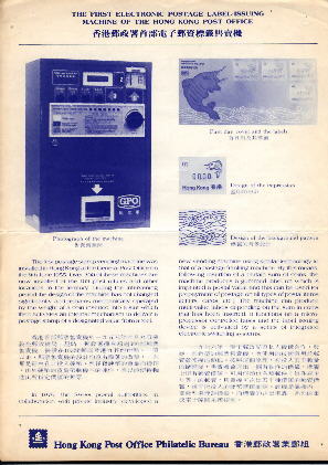 | 關於電子郵資標籤 一九八六年香港郵政署引入一種名為『電子郵資標籤售賣機』 (以下簡稱郵資標籤) , 由瑞士LAUPERSWL屬下的公司於一九七五年研製 , 公司名稱叫FRAMA AG , 是故有些集郵者直稱郵資標籤為『FRAMA』 . 這部機器仿照郵資打印機(FRANKI NG MACHINE)的構造原理發展而成 , 裡面靠一組電子機件控制 , 把郵資印在有背膠的紙帶上 , 這有別於卷筒郵票 .最初的郵資標籤售買機設有四種面額 , 由按扭及旋扭操作 , 供投硬幣後選擇所需郵資 . 第一次郵政標籤以波紋圖為背面景 , 正面印有鯉魚圖案 , 極具中國傳統色彩 . 香港郵政署擬每年更換一次背景標籤上的圖案 , 首輯的農曆新年(生肖)由一九八八年開始發行 . 首部郵資標籤售賣機安裝在中環郵政總局外 , 正式使用日期為一九八六年十二月三十日 , 圖案上印有[01]的代號 . 第二部售賣機於一九八七年八月十八日 , 在尖沙咀郵局投入服務 , 圖案代號[02] . |