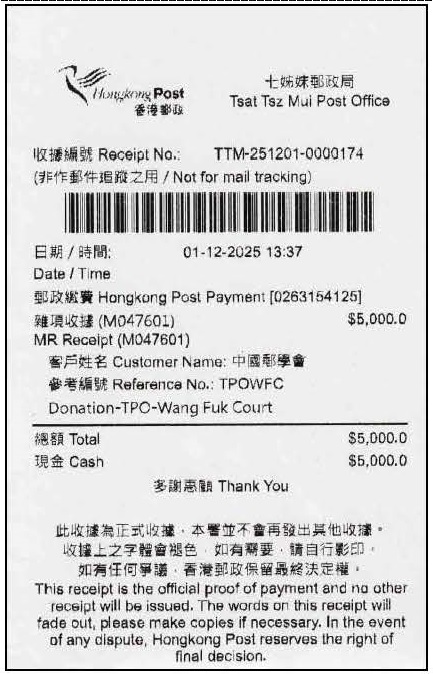 大埔宏福苑火災 本會捐款援助災民 2025年11月26日下午,新界大埔宏福苑發生嚴重火災,導 致200多人傷亡,本會謹對遇難者致以哀悼,向遇難者家屬及災民表示慰問,祝願傷者早日康復,希望受影響災民生活早日恢復正常。為救濟災民,港府在大火發生翌日即成立「大埔宏福苑援助基金」,接受市民各界捐助。本會在11月29日星期六召開的理事會議,特別通過議案,以本會名義,向該基金捐款5,000元,薄盡綿力,以表示中國郵學會對災民的關懷。香港郵政轄下各分局亦由11月29日起代收捐款,本會遂於12月1日(星期一) 前往港島七姊妹郵政分局捐款,圖為郵局發出的捐款收據。自火災發生後,港府為協力同心應對災情及展開救災工作,隨即暫停了一切有關立法會換屆選舉的宣傳,從郵局發出的收據上可見,原本的設計印有「2025.12.7 立法會換屆選舉」語句及「喜迎大熊貓」和熊貓圖像,均已刪除,讀者可與上期會訊(12月號第527期)第8頁刊登的一張11月中旬打印的郵局收據作一比較。